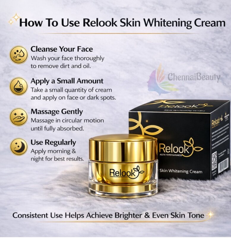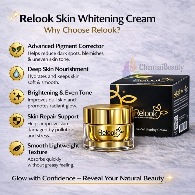 The Relook Skin Whitening Cream is an exclusive, highly effective treatment designed to combat the appearance of dark spots, blemishes, and pigment-related skin concerns. Unlike many standard moisturizers, this cream features a fine, smooth consistency without a water-logged base, allowing potent ingredients to penetrate the skin more powerfully.